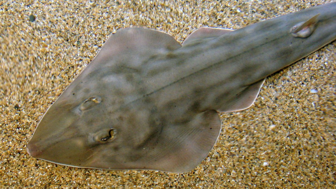 Did you know that the guitarfish has been playing it flat for 100 million years? We now have three making beautiful music together in our Aviary. It gets its name from a long, pointed snout and guitar-shaped body. It lies in ambush with its eyes sticking out of the sand, waiting for careless crabs to wander by. Lunch!