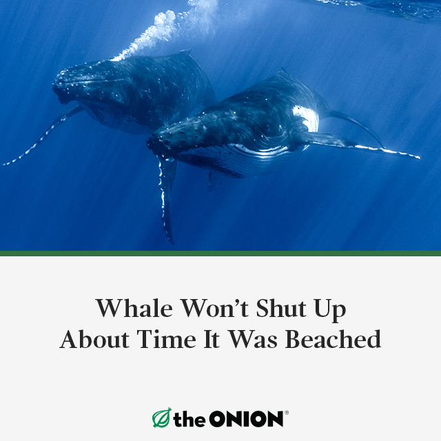 ATLANTIC OCEAN—Noting that the marine mammal looks for any excuse to bring up the incident, sources confirmed Friday that a local humpback whale still won’t shut up about the one time he was beached. “Christ, whenever someone even mentions the shore, the coast, sand, anything, he immediately chimes in with the same goddamn story about the time he got stranded out of the water for ‘a whole day,’” said a member of the whale’s pod, adding that the overdramatic cetacean constantly exaggerates how far up on the beach he was and “acts like he got stuck on the fucking boardwalk.” “We’ve all heard a million times that the only thing he could do was flap his tail and how it took 30 rescue workers to get him back into the ocean. Just give it a rest—anyone can be beached, okay? Big deal. Does he even realize that it’s actually way more impressive to, you know, stay in the water?” At press time, sources close to the whale conceded that his story about being entangled in fishing nets was actually pretty cool, though they’d never give that annoying asshole any satisfaction by telling him.