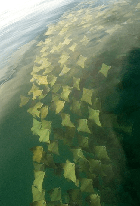 Typically measuring ~88 centimeters (but with recordings found up to 104 centimeters), the venomous golden cow-nose rays migrate in groups of up to 10,000 as they make their way towards their summer feeding grounds in the Gulf of Mexico.