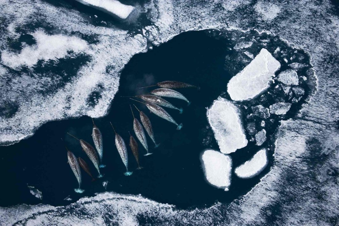 Narwhals in sea ice, shot from an ultralight plane on floats in the