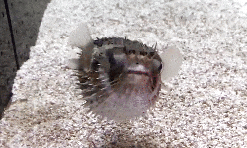 The Ocean Sunfish, or Mola Mola, is the heaviest bony fish in the world, with adults weighihg in at 1 tonne. The word “mola” is Latin for millstone, and the fish is named this due to the flat and round shape, grey colour and rough skin. The Ocean Sunfish is in the same family as pufferfish and porcupinefish, and like the rest of this family, has four fused teeth that form a beak. They use this beak to feed on small fish, jellyfish, squids, crustaceans, and salps. Ocean Sunfish produce the most eggs in the animal kingdom, able to produce up to 300 million eggs at a time. Sunfish fry look more similar to other species of pufferfish than to adult Mola Mola.