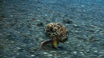 is, despite its name, no bigger than a tangerine. Also uses a “slow bounce” to hunt. With its body flattened, and dorsal arms reaching forward, the octopus glides with sporadic bursts of hopping movements before it snatches up its prey of choice.