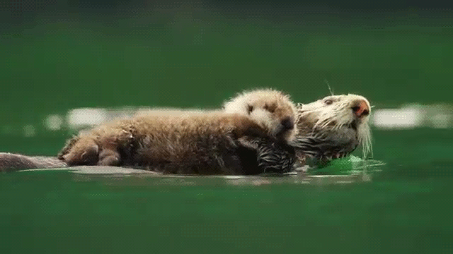 [A mom and baby otter are floating together. The baby otter is sleeping on his mom’s tummy so he’s still all dry and fluffy. She keeps giving him little otter kisses.]